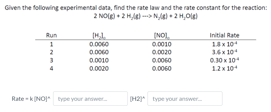 This question is a common exam question and in this v. A rate law for this chemical reaction will be defined as: One method of directly measuring k, p, and q is called the method of initial rates. 2) now compare experiments 1 and 3. See the example below for more examples of rate laws.